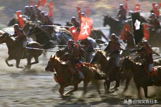 《影武者》这部电影中的色彩运用,也给人留下了深刻的印象。导演借用武田家的军旗“风林火山”,将武田家的军队以黑色(风)、绿色(林)、红色(火)与紫色(山)四种颜色分成四个部分,在观影期间可能并不理解导演为何要这么做,但是看到片尾时才发现,这是导演为片尾的决战场景所做的铺垫。